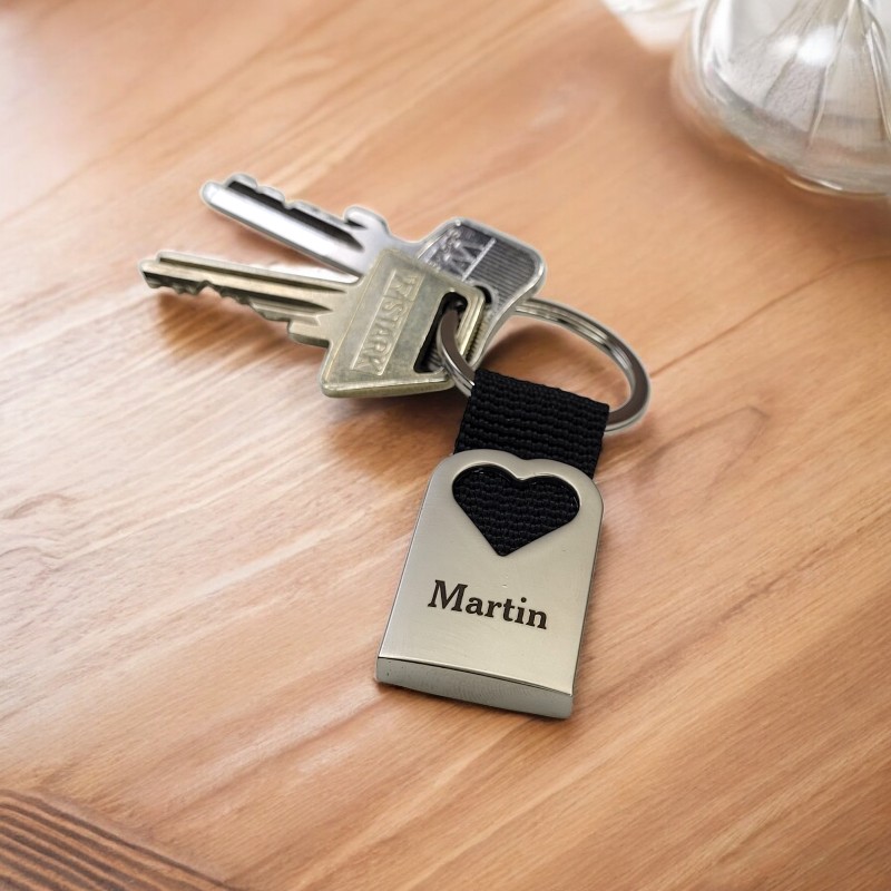 Nøgleringen er udstyret med et hjerteformet udskæringsdesign og plads til gravering af et navn på forsiden og en lille tekst på bagsiden.