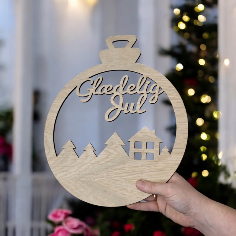 - Design: Udskåret tekst “Glædelig Jul” med vinterlandskabsmotiv