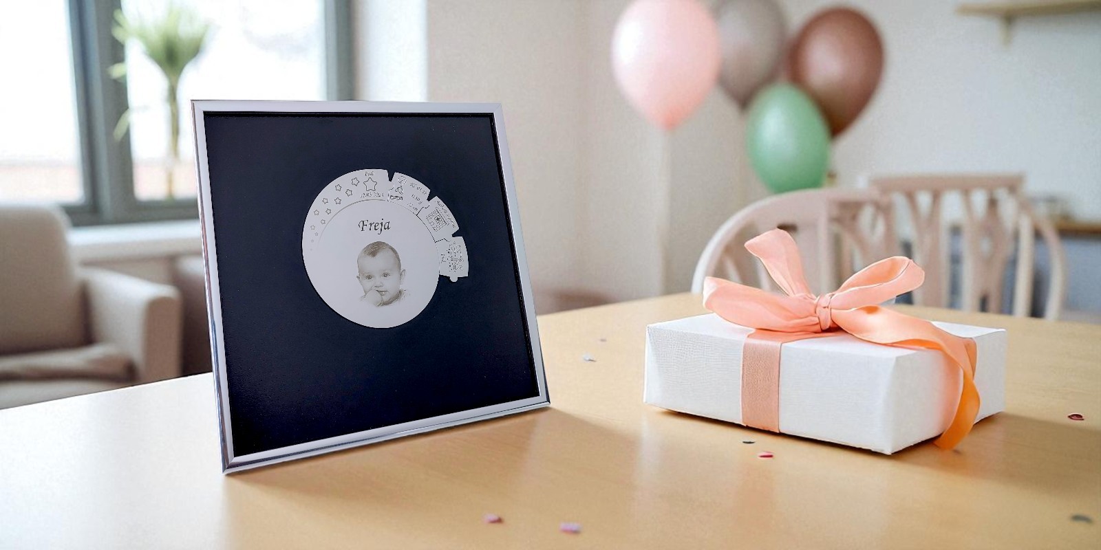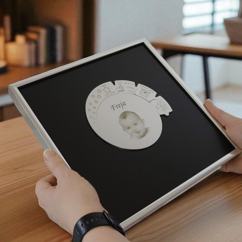 Det betyder, at dit billede får lys, skygger og ansigtskonturer, hvor du kan se selv de mindste detaljer. Midterpladen fører ud i en spiral, hvor barnets fødselsdato graveres sammen med en stjernerække. - Indramning i elegant smal aluramme med plads til 25 brikker